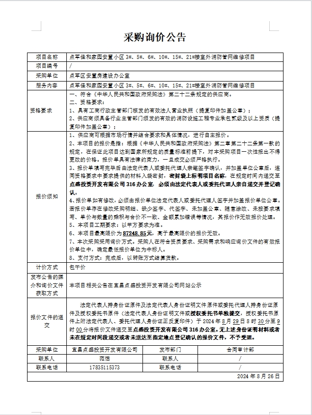 點(diǎn)軍佳和家園安置小區(qū)3#、5#、6#、10#、15#、21#樓室外消防管網(wǎng)維修項目詢價公告